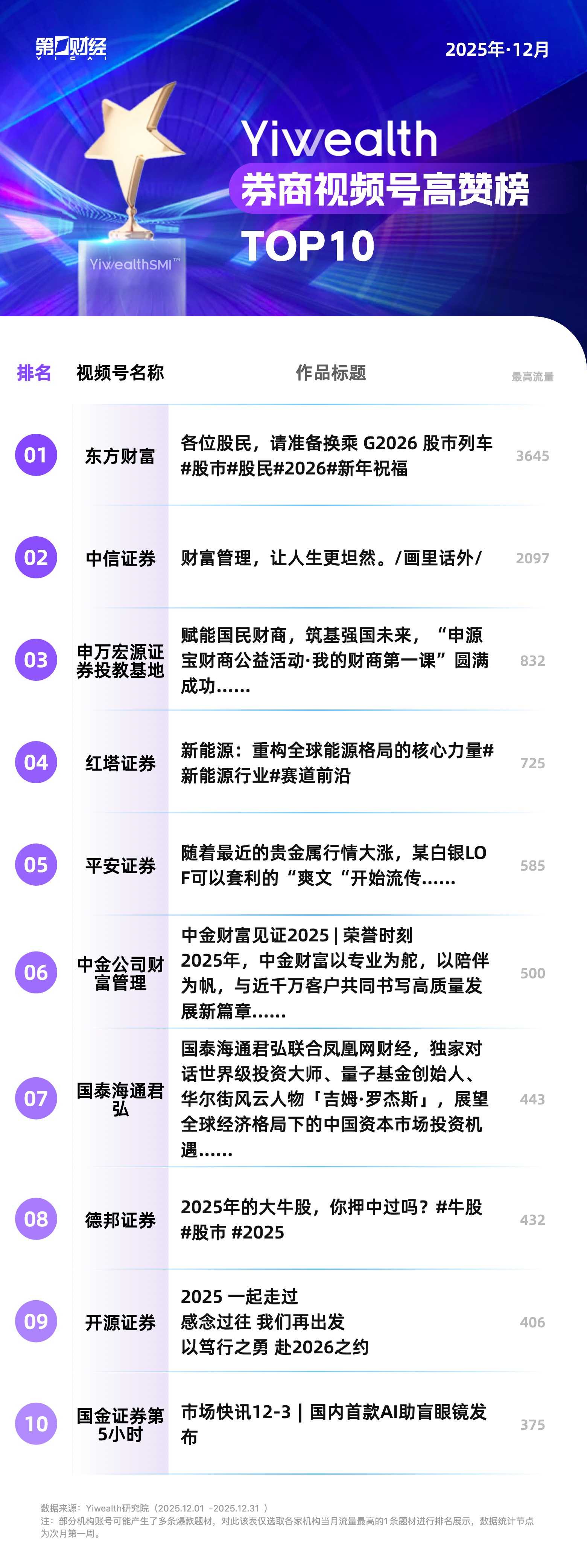 视频号高赞榜呈现两大主题:年终展望和投资者教育。年终展望方面,东方财富的"G2026股市列车"以3645点赞领跑、德邦证券的"2025大牛股回顾"、开源证券的年终盘点等内容,总结2025年行情展望2026投资机会。投资者教育方面,中信证券的"让人生更坦然"获得2097点赞、申万宏源的"赋能国民财商"公益活动收获832点赞、平安证券的"白银LOF套利"解惑,强调理性投资和长期价值。此外,红塔证券、国泰海通等关注新能源、全球投资等前瞻性话题,也受到用户青睐。