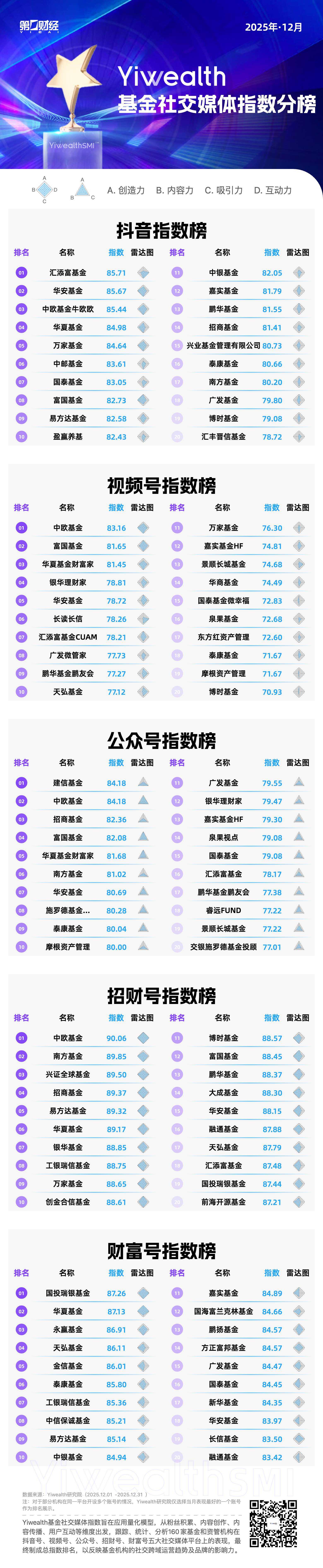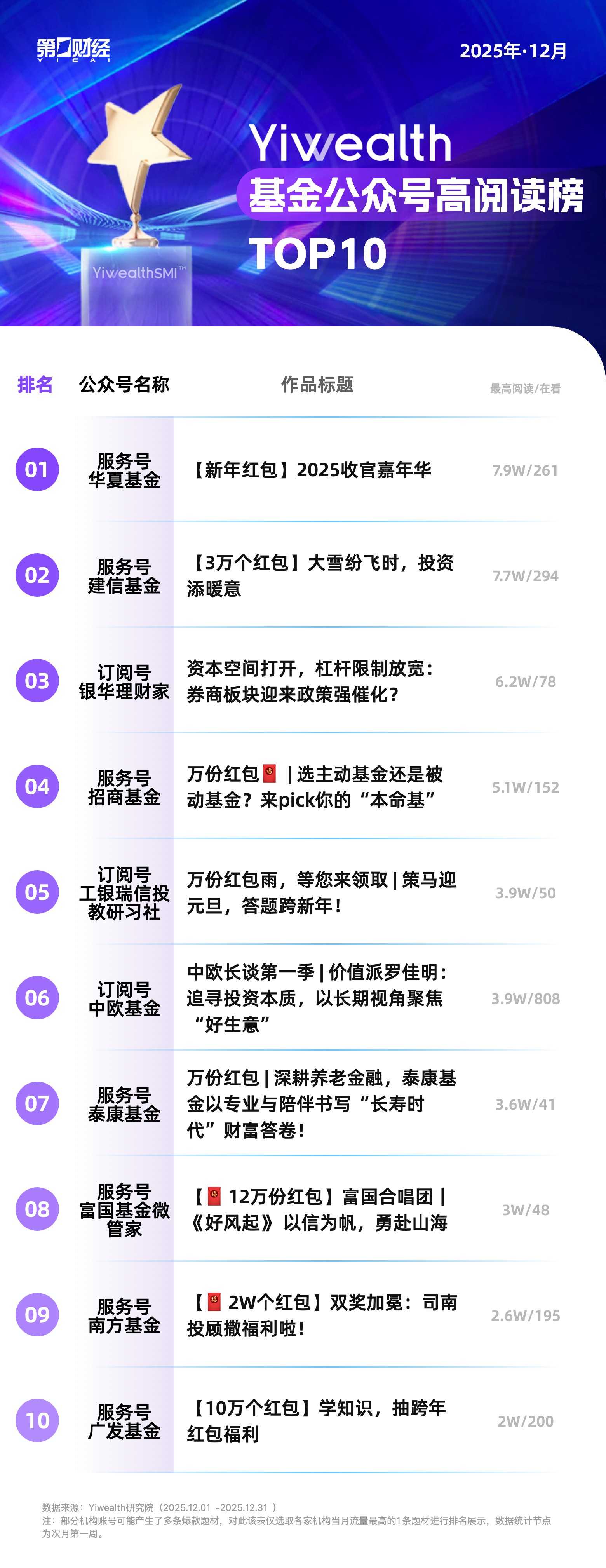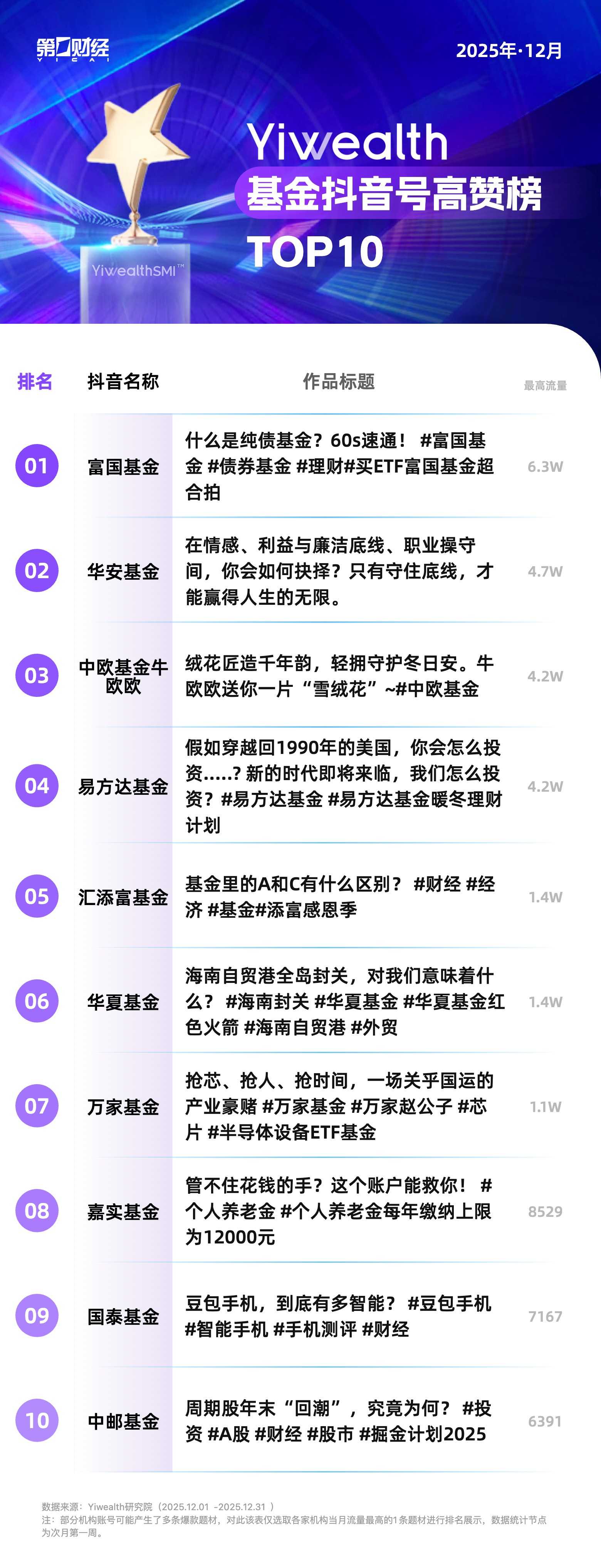 12月基金视频号多个深度解读类作品登上高赞榜。例如华夏基金财富家深度解读“算电协同”在AI产业发展中的重要作用;财通证券资管《投资时令说·老友记》访谈城市银发族,探讨退休生活、养老焦虑等深度话题;天弘基金解读热门赛道“人形机器人”的投资机遇。